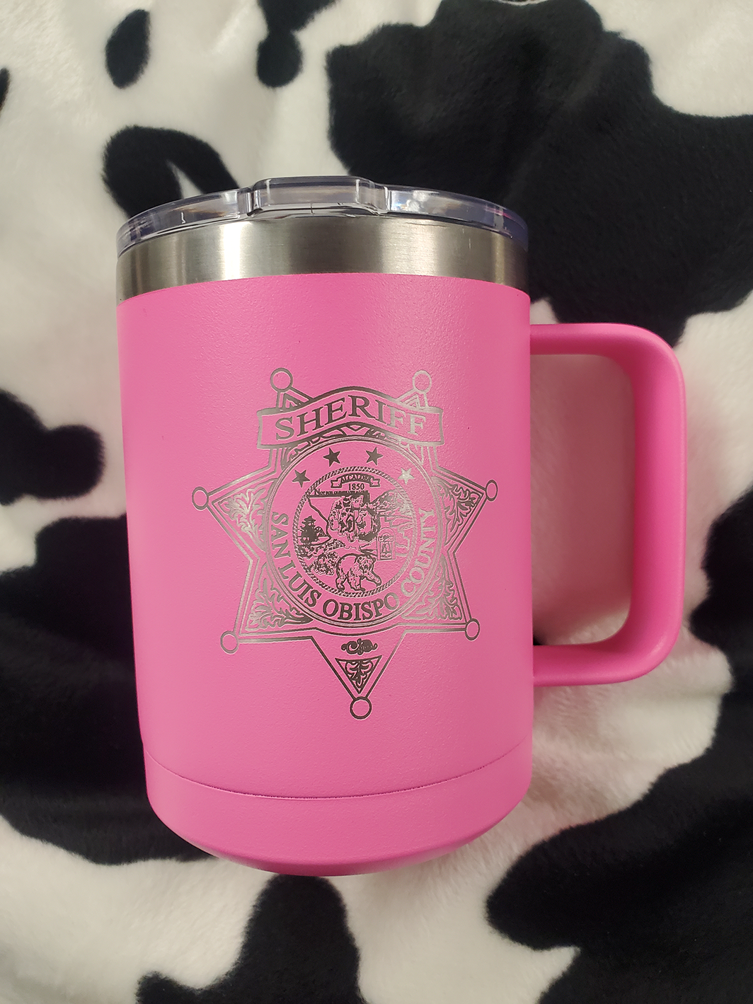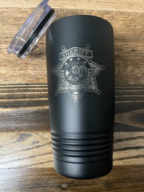 Custom Sheriff's Office 20 oz. Stainless Steel Polar Camel Tumblers features double-wall vacuum insulation with a clear lid. The mug has a narrower bottom to fit most standard cup holders. Polar Camels are made from 18/8 gauge stainless steel (18% chromium/8% nickel) - also known as Type 304 Food Grade. Each tumbler will be engraved with the Sheriff's Office logo on one side and you have an option of customizing on the other side.
